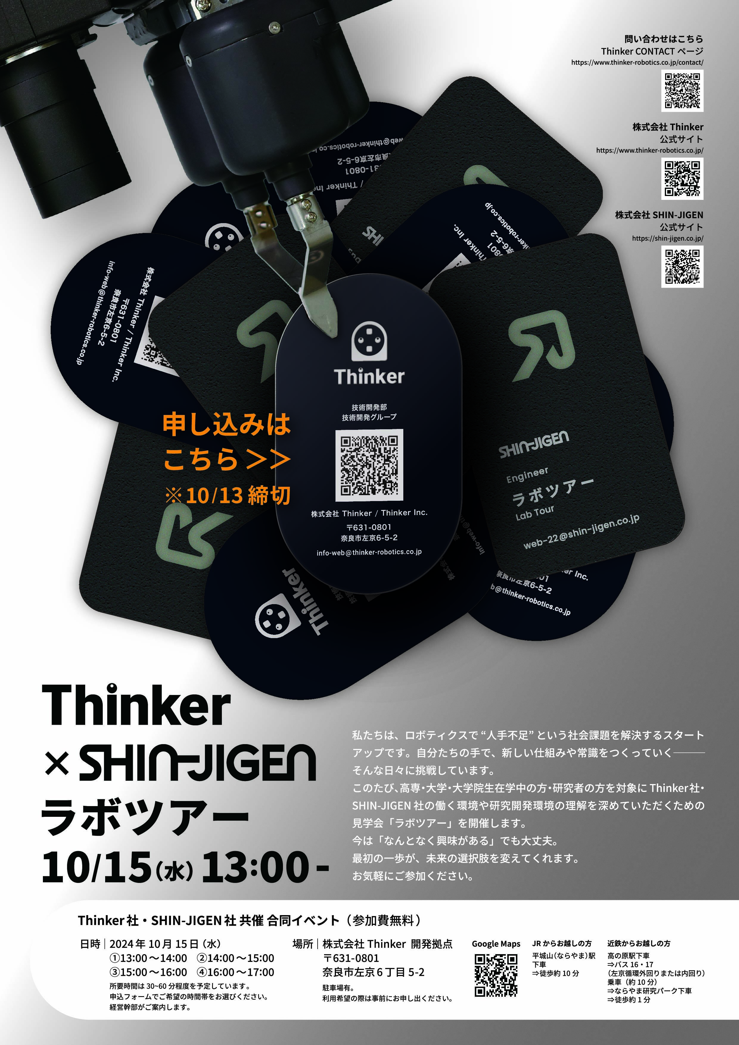 高専・大学・大学院在学中の方、および研究者の方を対象にThinker 社・SHIN-JIGEN 社の働く環境や研究開発環境の理解を深めていただくための見学会「ラボツアー」を開催します。当社で働くことに少しでも興味を持った方は、ぜひご参加ください。
